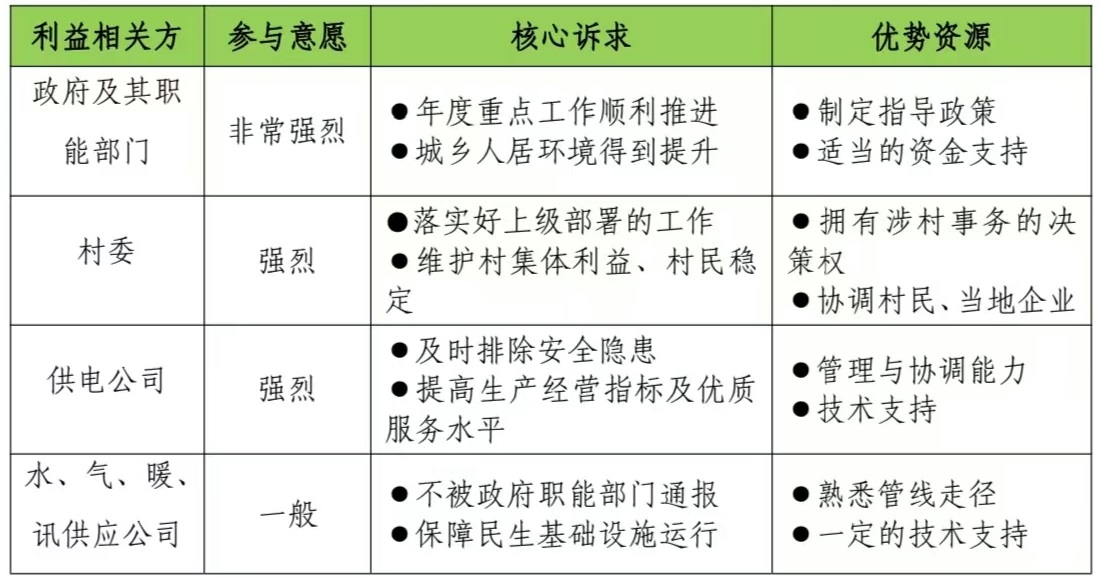 轉(zhuǎn)變以往單打獨(dú)斗的固有工作方式,識(shí)別農(nóng)村配電規(guī)劃建設(shè)有關(guān)的利益相關(guān)方,分析其訴求、資源優(yōu)勢(shì),充分考慮其合理建議、期望和訴求,找到各方利益相關(guān)方的聯(lián)結(jié)點(diǎn),形成“政府主導(dǎo)、供電公司推動(dòng)、水氣暖訊企業(yè)協(xié)同配合、客戶(hù)受益、多方共贏(yíng)”的推進(jìn)模式。